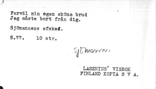 //// * " - - - - - - //// Farväl min egen sköna brud //// Jag måste bort från dig. //// Sjömannens afsked. //// S.77. lo str. //// i //// ! //// LASENIUS" VISBOK //// FINLAND KOPIA SVA. //// - //// - ////