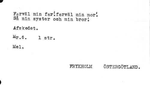 //// t //// Ferväl min farifarväl min mort //// Sa min syster och min brori //// Afskedet. //// ARr.6. l str. //// Mel. //// FRYKHOLM ÖSTERGÖTLAND. ////