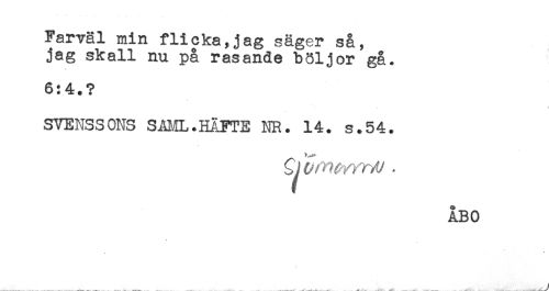 //// Farväl min flicka,jag säger så, //// jag skall nu på rasande böljor gå. //// 6:4.? //// SVENSSONS SAML.HÄFTE NR. 14. s.54. //// ÅBO ////