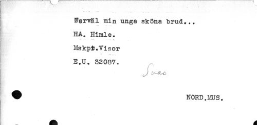 //// ! Farväl min unga sköna brud... //// HA. Himle. //// ä * - //// Ms kpjb. Visor //// E.U. 32087. //// ^ NORD. MUS. ////