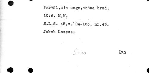 //// Farväl,min unga, sköna brud, //// } //// 10:6. M.M. //// * //// * * ' //// S.L.S. 45,s.104-106, nr.43. //// Jakob Lassusi //// ! - //// R'-' //// /l //// / ^ //// , j ABO ////