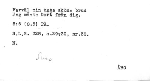 //// Fgrväl min unga sköna brud //// Jag måste bort från dig* //// * + + 3 //// 5:6 (8.5) PÅ. //// < //// -- v //// S.L.S. 328, s.29?30, nr.30. //// N. //// ÅBO ////