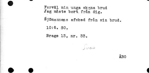 //// Farväl min unga sk ana brud //// J*ag måste bort från dig. //// *** //// Sjömannens afsked från sin brud. //// 4 //// 10:6. SO. //// Brage 13, nr. 33. //// /i //// ÅBO //// ! ////