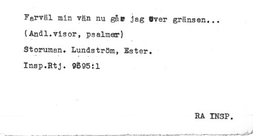 //// Farväl min vän nu gåa jag 8ver gränsen... //// (Andl.visor, psalmetr) //// Storuman. Lundström, Ester. //// Insp.Rtj. 9695:1 //// RA INSP. //// ^ ____ , ////
