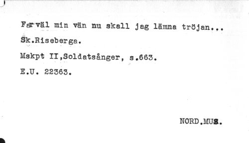 //// < //// Farväl min vän nn skall jag lämna tröjan... //// Sk.Riseberga. //// Mskpt II,Soldatsånger, s.663. //// E.U. 22363. //// NORD.MU&. ////