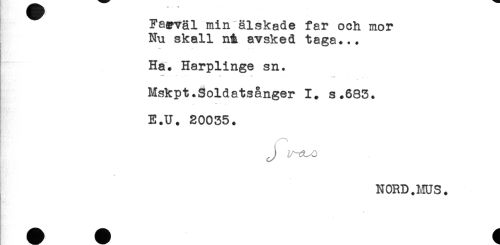 //// Fayväl min älskade far och mor //// Nu skall nå avsked taga... //// Ha. Harplinge sn. //// Mskpt.Soldatsånger 1. s.683. //// E.U. 20035. //// NORD.MUS. ////