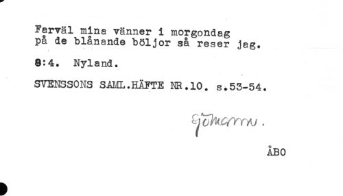//// Farväl mina vänner i morgondag //// pa de blånande böljor så reser jag. //// o //// 8:4. Nyland. //// SVENSSONS SAML.HÄFTE NR.10. s.53-54. //// ÅBO ////