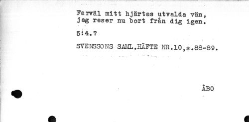 //// Farväl mitt hjärtas utvalda vän, //// jag reser nu bort från dig igen. //// - //// 5:4.? //// ' * //// SVENSSONS SAML.HÄFTE NR.10.s.88-89. //// i- - 'K -i, < //// ..... * - * .... ... .t //// P* < //// ^ ÅBO ////