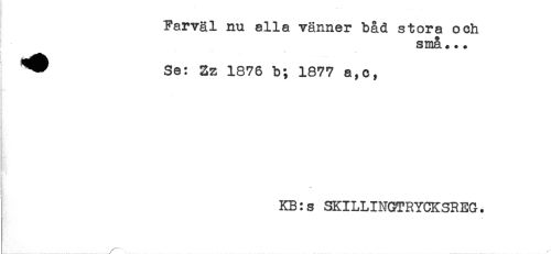 //// Farväl nu alla vänner bad stora och //// små... //// i - //// * Se: Zz 1876 b; 1877 a,c, //// KB:s SKILLINGTRYCKSREG. ////