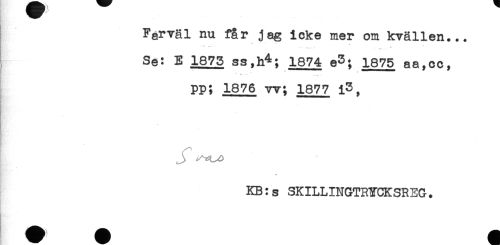 //// Farväl nu får jag icke mer om kvällen... //// Se: E 1873 ss,h4; 1874 e3; 1875 aa,cc, //// pp; 1876 w; 1877 i3, //// ,,, ^ //// KB:s SKILLINGTRYCKSREG. ////