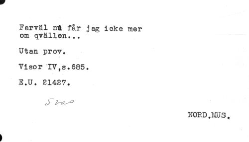 //// Farväl ni får jag icke mer //// om qvällen... //// Utan prov. //// < //// Visor 'IV,s.685. //// E.U. 21427. //// NORD.MUS. ////