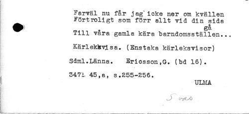 //// Farväl nu får jag'icke ner om kvällen //// Förtroligt som förr allt vid din sida //// Till våra gamla kära barndomsställen... //// Kärlekhyisa. (Enstaka kärleksvisor) //// Sdml.Länna. Ericsson,G. (bd 16). //// * ' //// B^* * //// 347L 45,a, s.255-256. //// ULMA //// t___ ////