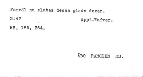 //// Farväl nu slutas dessa glada dagar, //// 3:4? Uppt.Wefvar. //// R5, 186, 364. //// ÅBO RANCKEN MS. ////