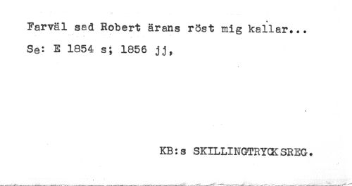 //// -** - //// Farväl sad Robert ärans röst mig kallar... //// Se: E 1854 s; 1856 jj, //// \ //// KB:s SKILLINGTRYCKSREG. ////