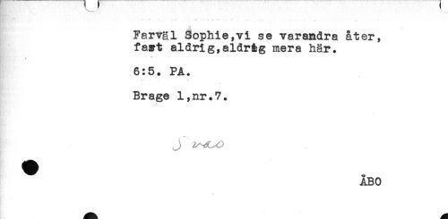 //// - : - .......- - - //// Farväl 3ophie,vi se varandra åter, //// fact aldrig,aldråg mera här. //// 6:5. PA. //// - . . * //// Brage l,nr.7. //// J //// ÅBO ////