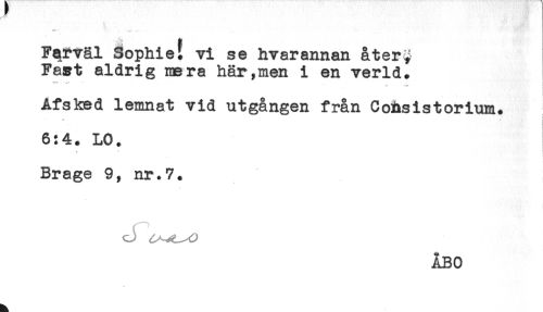 //// Fqfväl Sophie! vi se hvarannan återy //// Fa^t aldrig mera här,men i en verld. //// ' " * ' -T? //// Afsked lemnat vid utgången från CoRsistorium. //// - //// 6:4. LO. //// - //// Brage 9, nr.7. //// ÅBO ////