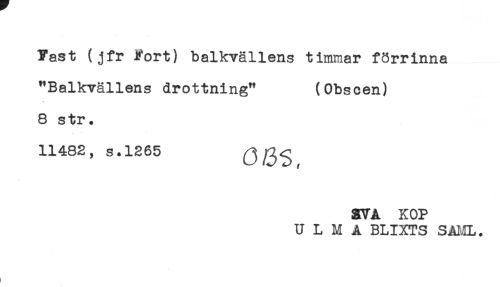 //// Fast (jfr Fort) balkvällens timmar förrinna //// "Balkvällens drottning" (Obscen) //// 8 str. //// 11482, s.1265 Ö6S //// SVA KOP //// U L M A BLIXTS SAML. ////