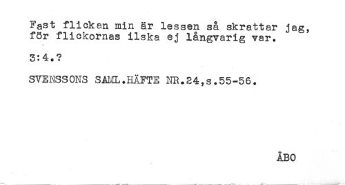 //// Fast flickan min är lessen så skrattar jag, //// för flickornas ilska ej långvarig var. //// 3:4.? //// SVENSSONS SAML.HÄFTE NR.24,s.55-56. //// ÅBO //// * ////