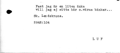 //// Fast jag är en liten änka //// vill jag ej sitta här o.värma bänkar... //// Sk. Landskrona. //// .s //// 2942:104 //// L U F ////