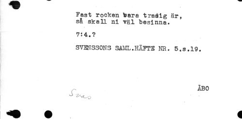 //// Fast rocken bara trasig är, //// så skall ni väl besinna. //// 7:4.? //// SVENSSONS SAML.HÄFTE NR. 5.S.19. //// ÅBO ////