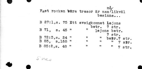 //// må //// /?ast rocken bära trasor är man'likväl //// besinna... //// B 27:l,s. 75 Ett avsigkommet Lejons //// betr. 7 str. //// B 71, s. 45 " " lejons betr. //// ^ ^ „ 7 str. //// B 72:3,s. 24 " " " betr.7 str. //// B 83, s.168 " ^ t. ^ 7 //// B 85:2,s. 48 " " " " 7 str. //// A ////