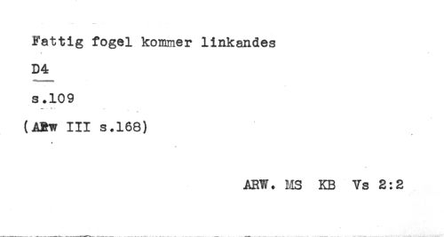 //// Fattig fogel kommer linkandes //// * * //// D4 //// s.109 //// ^ . .. //// (ABw III s.168) //// t //// ARW. US KB Vs 2:2 ////
