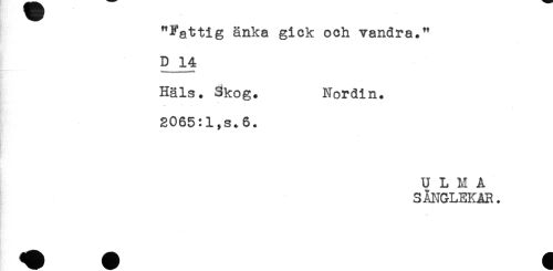 //// "Fattig änka gick och vandra." //// D 14 //// Häls. Skog. Nordin. //// * * //// 2065:1,s.6. //// U L M A //// S ÅNGLEKAR. ////