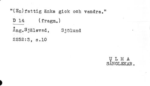 //// "(En)fattig änka gick och vandra." //// t //// D 14 (fragm.) //// Ång.Själevad, Sjölund //// * //// 2252:3, s.10 //// U L M A //// SÅNGLEKAR. ////