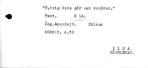 //// "Fattig änka går och vandrar." //// Text. D 14. //// Ång.Anundsjö. Ohlson //// 2002:3, s.39 //// U L M A //// SANGLEKAR. //// * ////