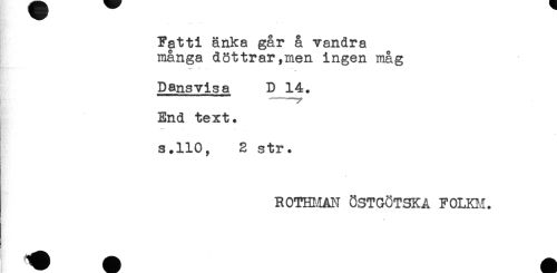 //// Fatti änka går å vandra //// många döttrar,men ingen måg //// * //// Dans vis a D 14. //// End text. //// s.110, 2 str. //// y, //// R 0TID.IAN ÖSTGÖTSKA FOLKM. ////