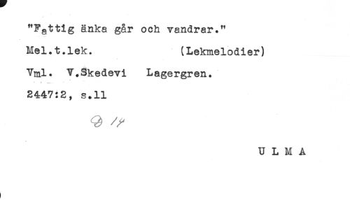 //// "Fattig änka går och vandrar." //// Mel.t.lek. (Lekmelodier) //// Vml. V.Skedevi Lagergren. //// 2447:2, s.ll //// U L M A ////