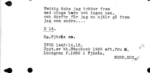 //// Fattig änka jag träder fram //// med många barn och ingen man, //// och därför får jag nu själv gå fram //// jag som andra.... //// ** //// D 14. //// ^-. //// Ha.Fjärås sm. //// * T ! //// IFOH 1443:14,15, //// Uppt.av bh.Stenbock 1928 eft.fru M. //// Lundgren f.1850 i Fjärås. //// NORD. MUS,y. //// ^ . . t ' ////