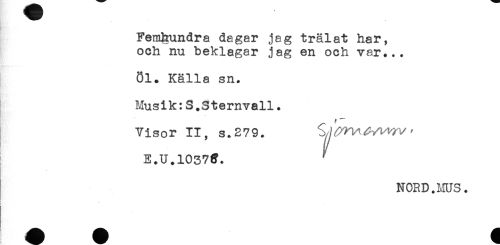 //// Femhundra dagar jag trälat har, //// och nu beklagar jag en och var... //// 81. Källa sn. //// Musik:S.Sternvall. //// Visor II, s.279. //// E.U.10373. //// NORD.MUS. //// 4 * //// ) ////
