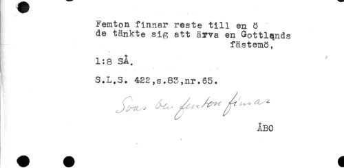 //// t- //// Femton finnar reste till en 8 //// de tänkte sig att ärva en Gottlqnds //// fästemö, //// 1:8 SÅ. //// * //// S.L.S. 422,s.83,nr.65. //// i //// ABO ////