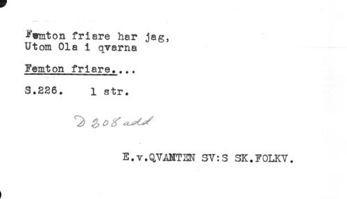 //// Femton friare har jag^ //// Utom Ola i qvarna //// Femton friare.... //// 3.226. i str. //// E.v.QVANTEN SV:S SK.FOLKV. ////