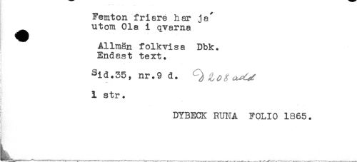 //// Femton friare har ja" //// ^ utom Ola i qvarna //// Allmän folkvisa Dbk. //// Endast text. //// : ' //// Sid.35, nr.9 d. , //// 1 str. //// ! //// ! //// DYBECK RUNA FOLIO 1865. //// i //// < //// < ////