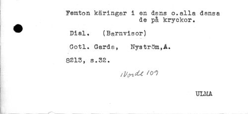 //// Femton käringar i en dans o. alla dansa //// de på kryckor. //// ^ Dial. (Barnvisor) //// - //// Gotl. Garde, Nyström,A. //// 8213, s.32. //// ! //// ! ULMA //// H * //// y. //// r //// R. //// &____,___ ___ ___- _< ____ ____ ____ ////