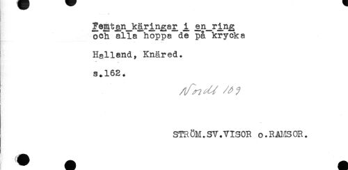 //// Femta,n_käri,n_gar i, //// och alla hoppa de på krycka //// * ... //// É //// Halland, Knäred. //// - ** //// s.162. //// STRÖM.SV.VISOR o.RAISOR. ////