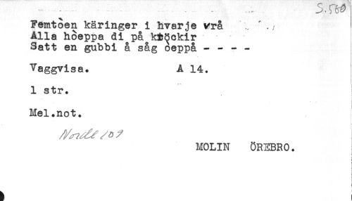//// *" - - - - --- ^ - ^ t 1 //// Femtoen käringer i hvarje vrå " //// Alla hoeppa di på ktöckir //// Satt en gubbi å såg oeppå - - - - //// Vaggvisa. A 14. //// ' ... ! //// 1 str. //// ' .- ! //// < //// Mel.not. //// /:; 7 ^ ^ ^ ^ //// MOLIN ÖR3BR0. //// ! //// t ////