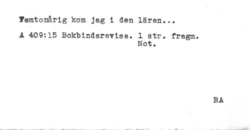 //// Femtonårig kom jag i den läran... //// A 409:15 Bokbindarevisa. 1 str. fragm. //// Not. //// RA ////