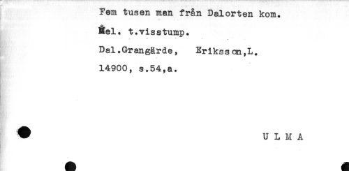 //// Fem tusen man fran Dalorten kom. //// ** //// Mel. t.visstump. //// Dal.Grangärde, Erlksson,L. //// * t' * //// 14900, s.54,a. //// . //// ^ U L M A ////