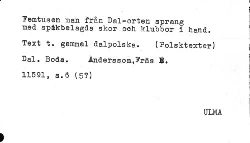 //// * * ? //// Femtusen man frän Dal-orten sprang //// med sptbkbelagda skor och klubbor i hand. //// ! //// t //// Text t. gammal dalpolska. (Polsktexter) i //// ! //// Dal. Boda. Andersson,Fräs E. //// 11591, s.6 (5?) //// ! //// t //// i //// ! //// * i //// ULMA ////