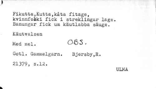 //// Fikutta,Kutta,kåta fitage, //// kvinnfo&ki fick i streklingar lage. //// Banungar fick um käutlabba säuge. ' //// Kautvalsen //// Med mel. OM , //// Gotl. Gannnelgarn. Bjersby,R. //// 21379, s.12. //// ULMÅ ////