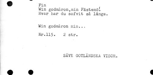 //// ^ Fin //// Win godmåron,min I^ästemöt //// Hvar har du sofvit så länge. //// w*--* //// Win godmåron min... //// Nr.115. 2 str. //// - //// SÄVE GOTLÄNDSKA VISOR. ////