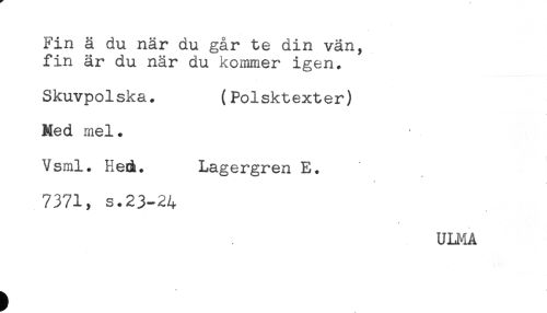 //// Fin ä du när du går te din vän, //// fin är du när du kommer igen. //// Skuvpolska. (Polsktexter) //// Med mel. //// Vsml. Hed. Lagergren E. //// 7371, s.23-24 //// ULMA //// ^ c ////