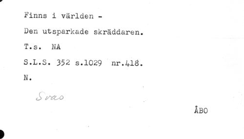 //// Finns i världen - //// Den utsparkade skräddaren. //// T.s. NA //// S.L.S. 352 s.1029 nr.413. //// N. //// t //// ÅBO ////