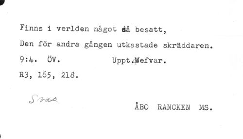 //// Finns i verlden något åå besatt, //// Den för andra gången utkastade skräddaren. //// 9:4. ÖV. Uppt^Wefvar. //// R3, 165, 21g. //// J....., //// ÅBO RÅNCKEN MS. ////