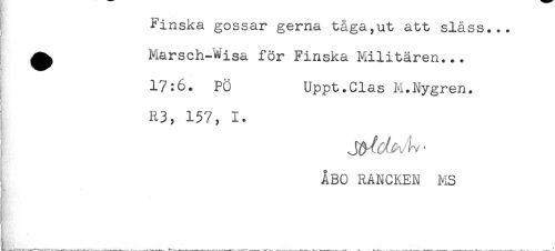 //// Finska gossar gerna tåga,ut att slåss... //// ^ Marsch-Wisa för Finska Militären... //// 17:6. PÖ Uppt.Clas M.Nygren. //// R3, 157, 1. //// ÅBO RANCKEN MS ////