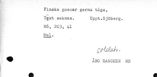//// * //// Finska gossar gerna tåga, //// Text saknas. Uppt.Sjöberg. //// R6, 203, 41 //// Mel. //// ^ ABC RANCKEN MS ////