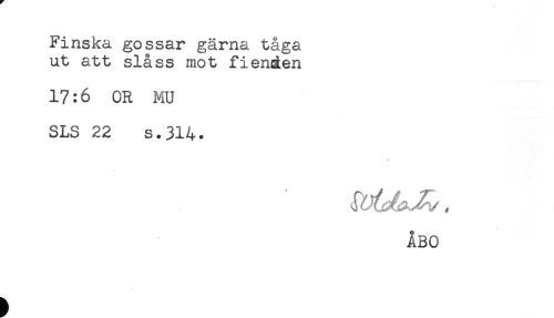 //// Finska gossar gärna tåga //// ut att slåss mot fienden //// 17:6 OR MU //// SLS 22 s.314. //// ÅBO ////